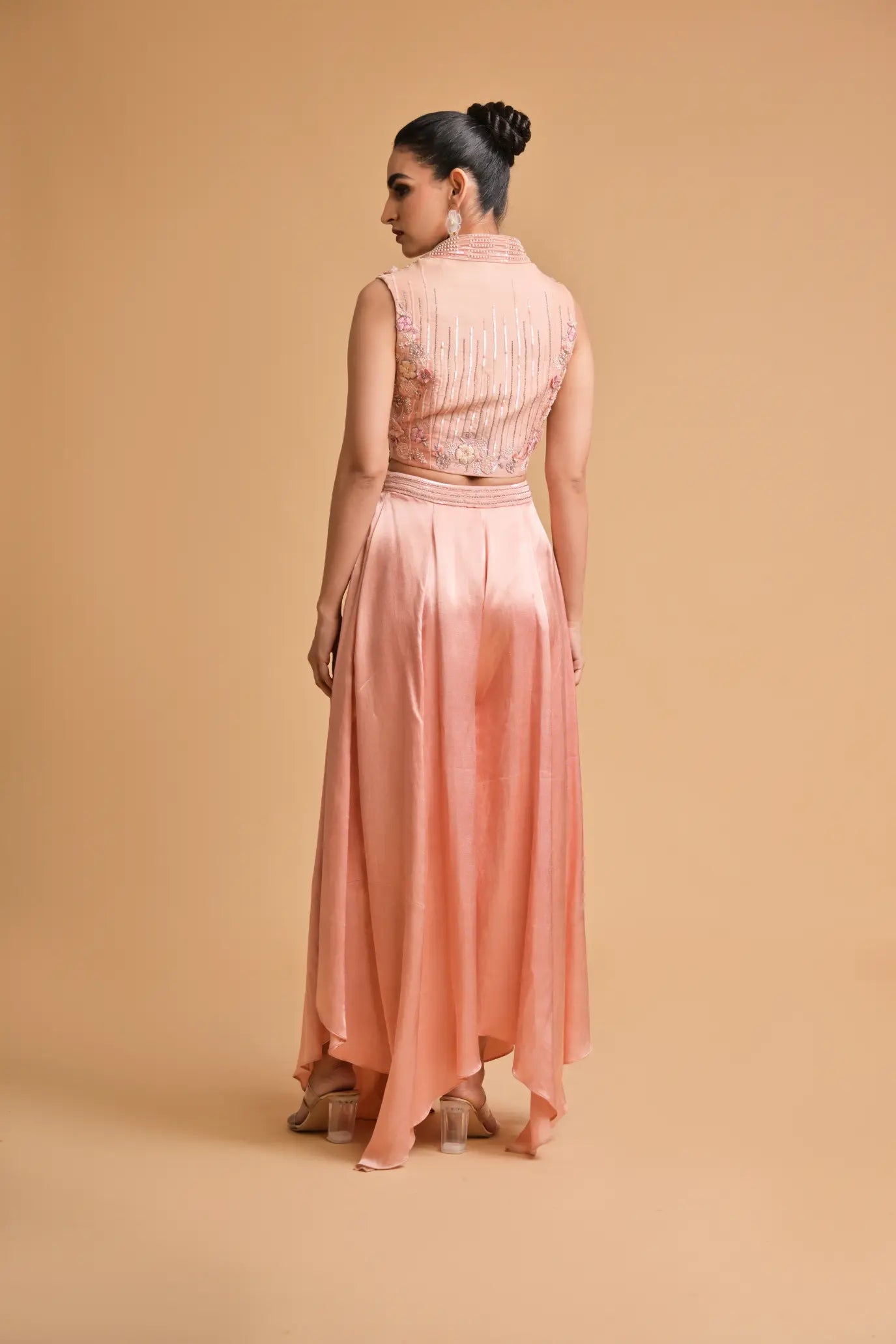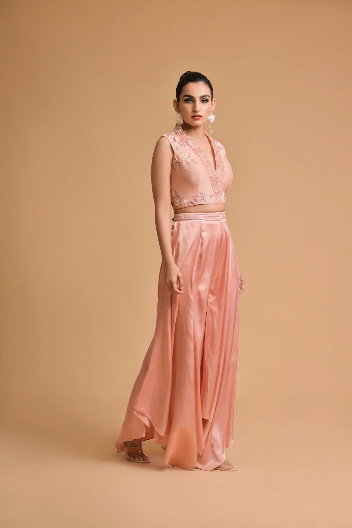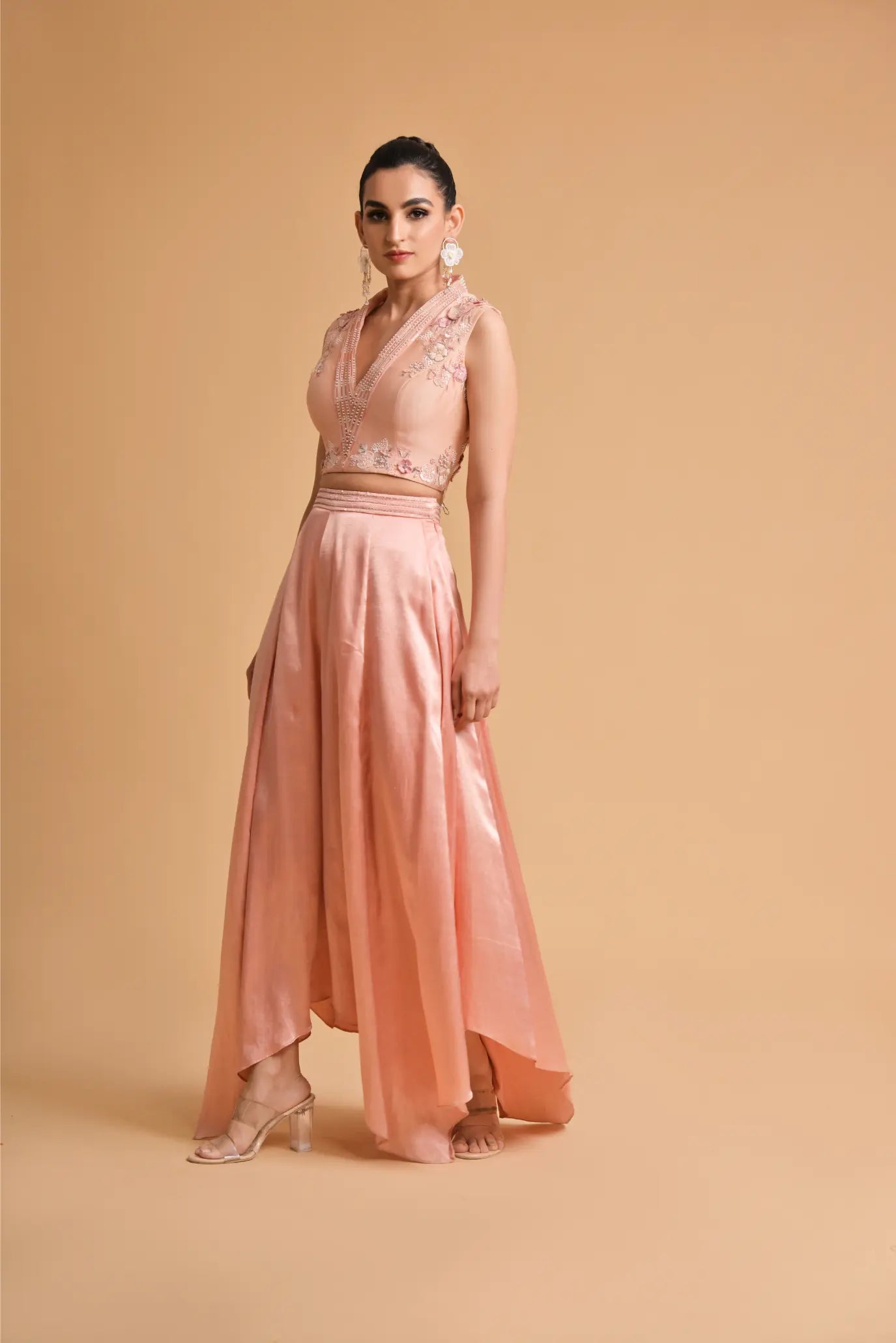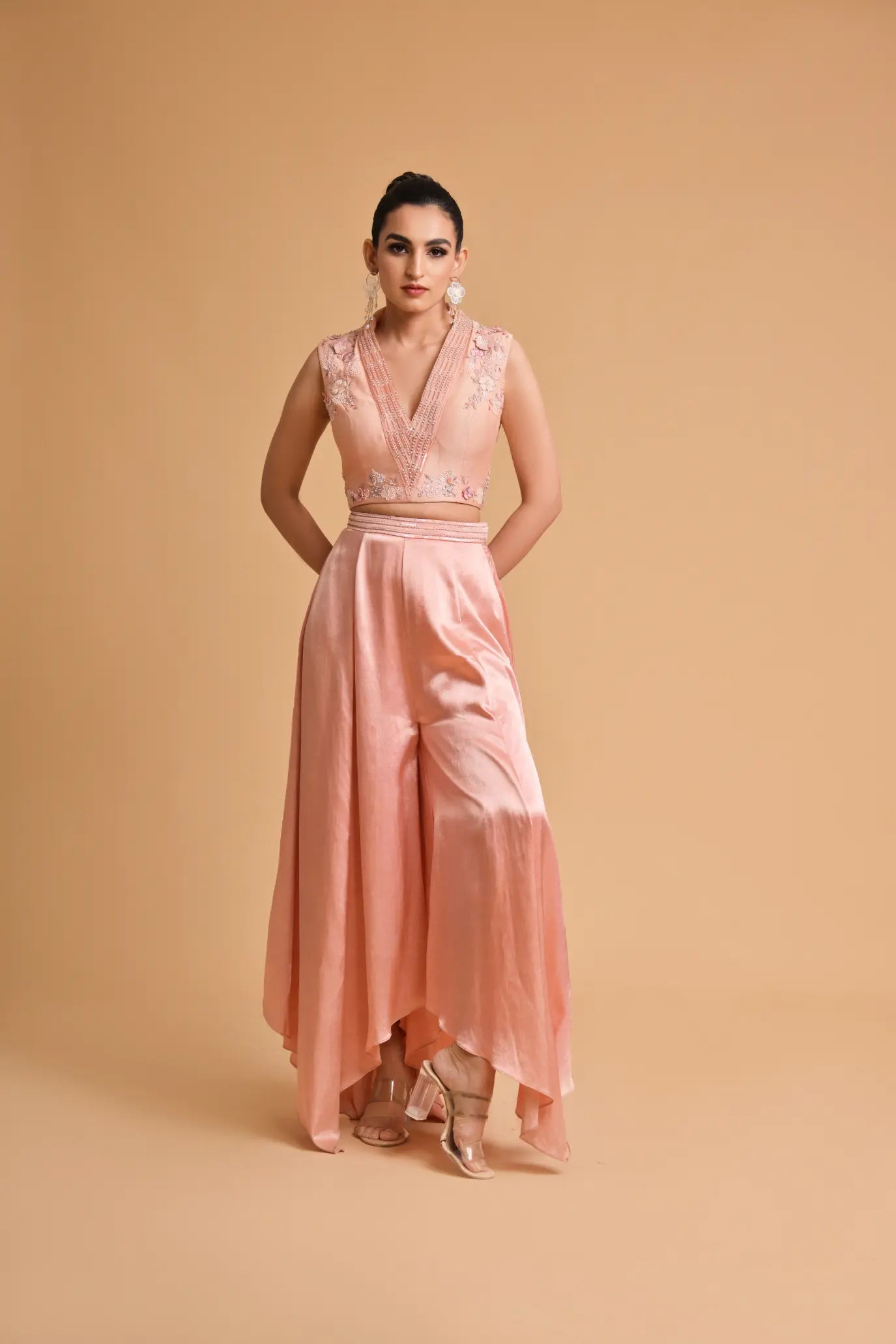 A stylish two-piece set featuring a Chanderi Crop Top with a sculpted neckline, embellished with pearls and cut beads, and 3D floral hand embroidery. The Gaji Silk Asymmetrical Pants are detailed with sequins and cut bead embellishments at the belt, making this set a perfect blend of elegance and modernity.
